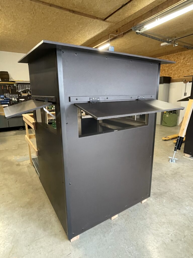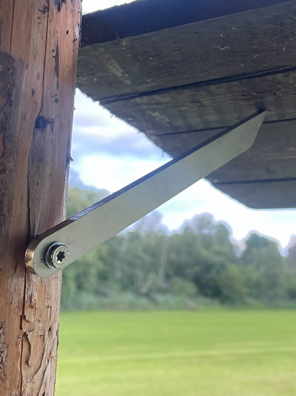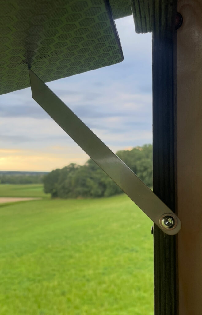 Mit einem Edelstahl-Fensterhalter können die Fenster individuell im Winkel zwischen 30° und 80° eingestellt werden. Das Sitz- und Schießbrett ist auf die komplette länge verstellbar. Für die Verriegelung der Fenster sorgen stabile Holz-Drehriegel. Die Fenster sind mit kugelgelagerten Edelstahlscharnieren ausgestatten und die Türe hängt massiv in drei Feuerverzinkten Torbändern. Zusätzlich ist die Tür mit einem abschließbaren Schlossriegel versehen. Außen werden witterungsbeständige Edelstahl-Spenglerschrauben verwendet, die für eine lange Haltbarkeit sorgen. Die Bodenplatte ist auf drei Balken montiert, und alle Schnittkanten im Außenbereich sind sorgfältig nachbeschichtet, um optimalen Schutz vor Feuchtigkeit und Witterungseinflüssen zu gewährleisten.