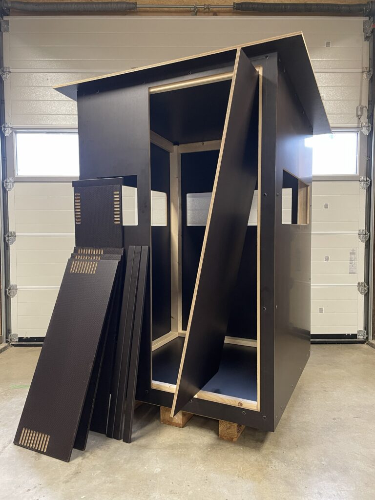 Die Jagdkanzel ist auch in Einzelteilen erhältlich und eignet sich ideal für Jäger, die selbst anpacken möchten. Das Paket besteht aus sechs fertig zugeschnitten Platten inklusive Fenster und Türausschnitte.