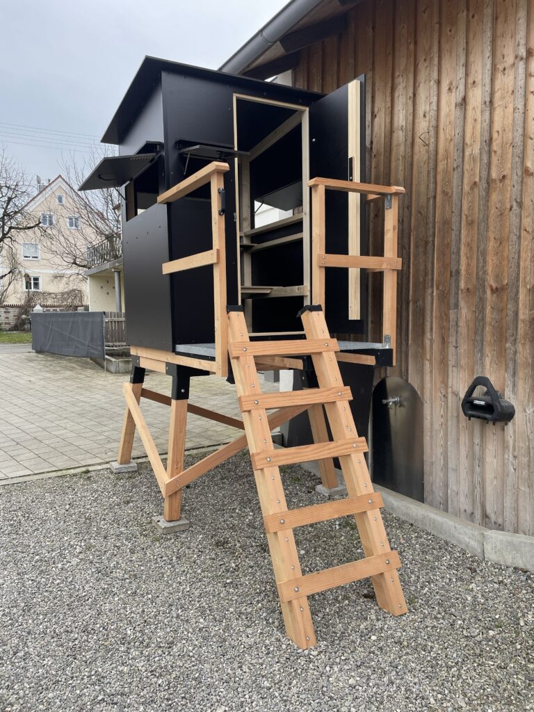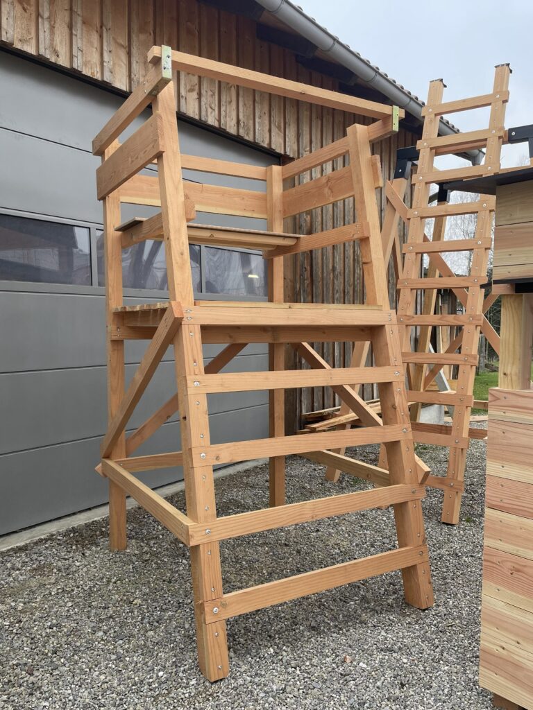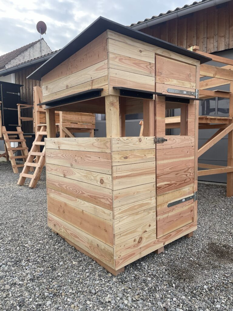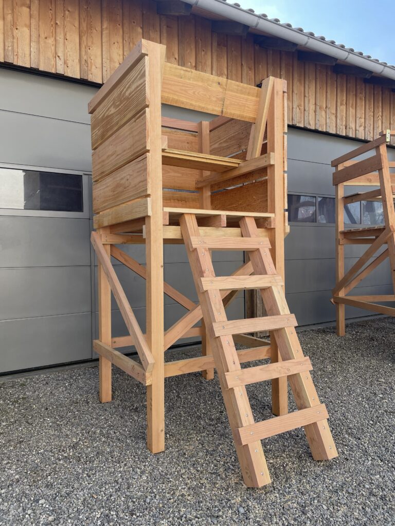 Bei uns erhältst du eine Jagdeinrichtungen bei der Qualität, Funktionalität und Langlebigkeit im Vordergrund stehen. Kein Aufquellen der Platten durch Verwendung von einer der hochwertigsten Platten, die es auf dem deutschen Markt gibt. Im Außenbereich verwenden wir Schrauben und Scharniere aus Edelstahl mit Dichtscheibe, um ein Aufquellen der Platten an der Verschraubung zu verhindern und eine möglichst lange Haltbarkeit zu erzielen. Durchdachte Bauweise und einfacher Aufbau dank langjähriger Erfahrung im Hochsitzbau. Das Schnittholz wird regional aus dem Naturpark Augsburg Westliche Wälder bezogen.