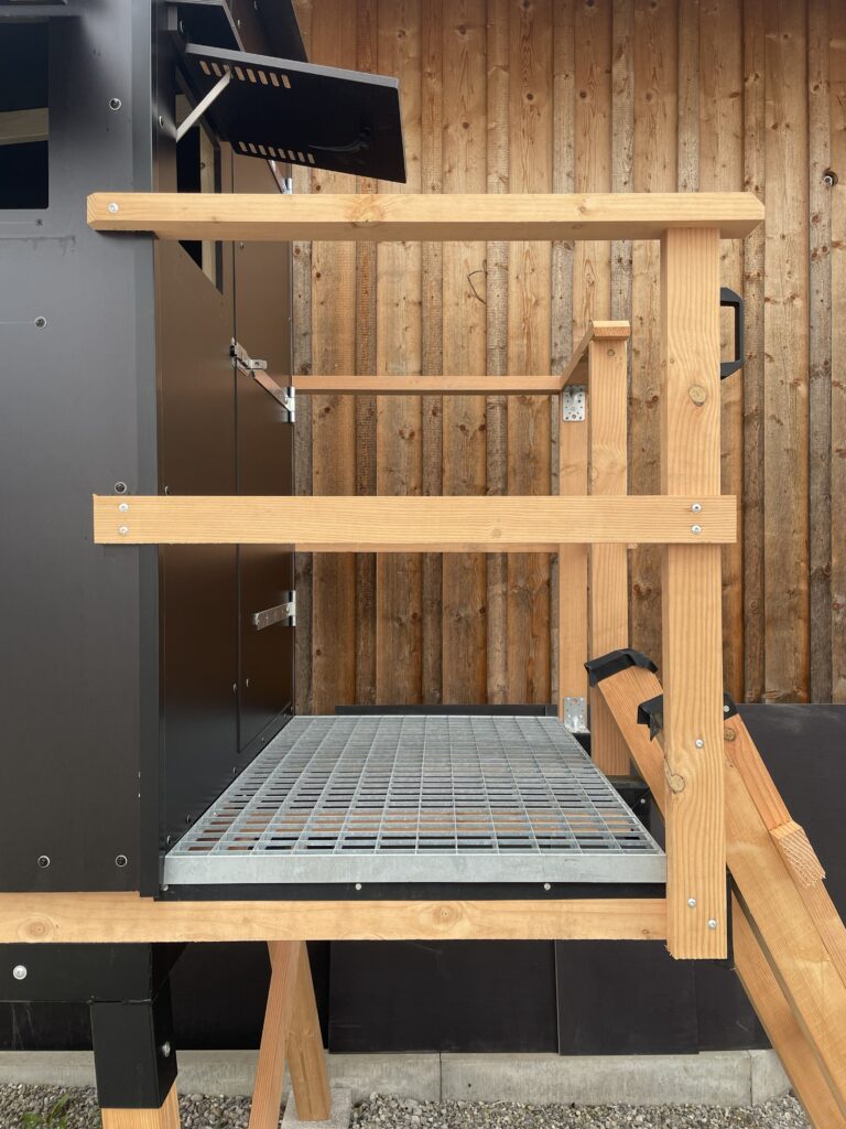 Weitere Extras sind ein seitlicher Einstieg, Teppichbeschlag innen, Isolierter Boden, Podest wahlweise mit Gitterrost oder Holzbelag, Blechdach, witterungsbeständige Dachfolie (EPDM), ein weiteres Fenster in der Rückseite und vieles mehr.